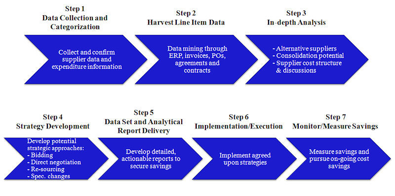 It's simple to begin a strategic sourcing initiative with SSA Capital. SSA Capital takes a "hands on" approach and works with existing information and resources in order to limit the time and effort required of the client. Typically, SSA Capital utilizes the following process: